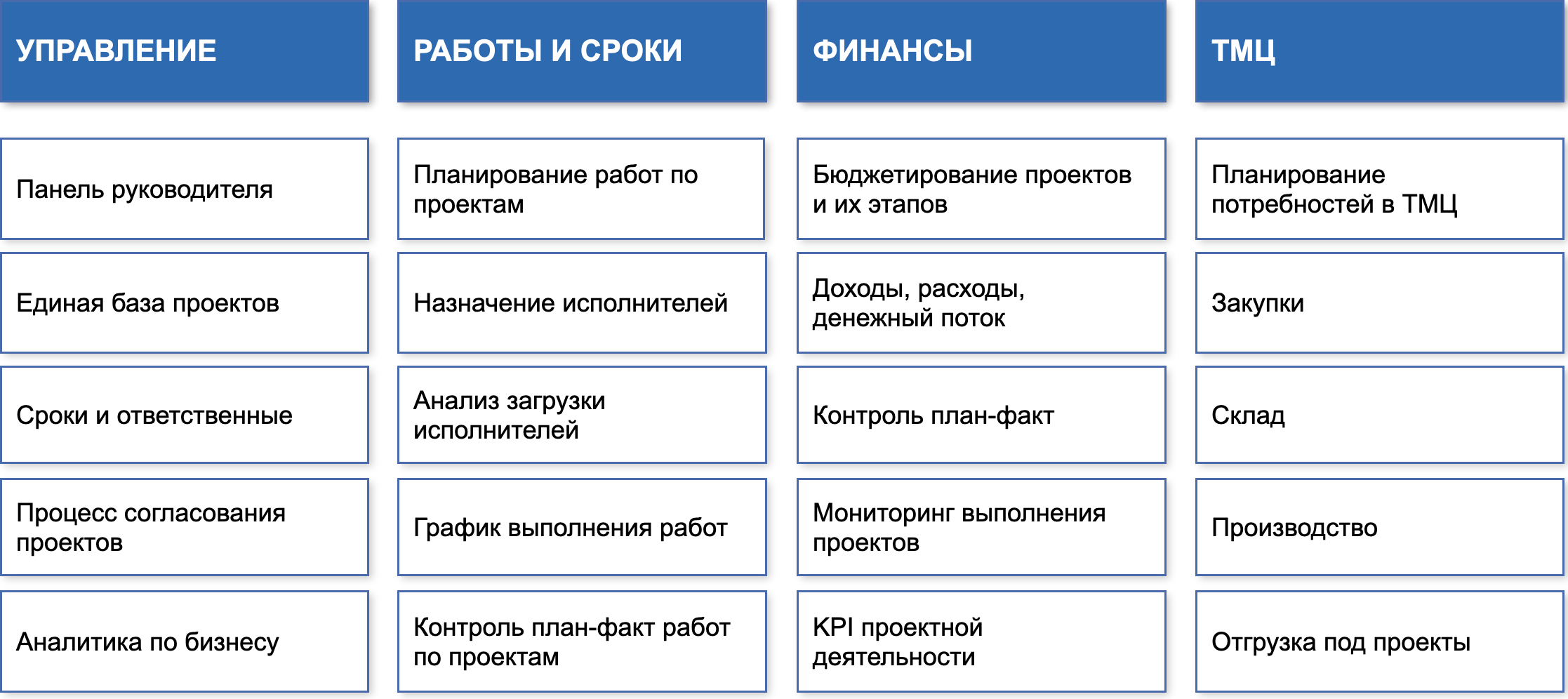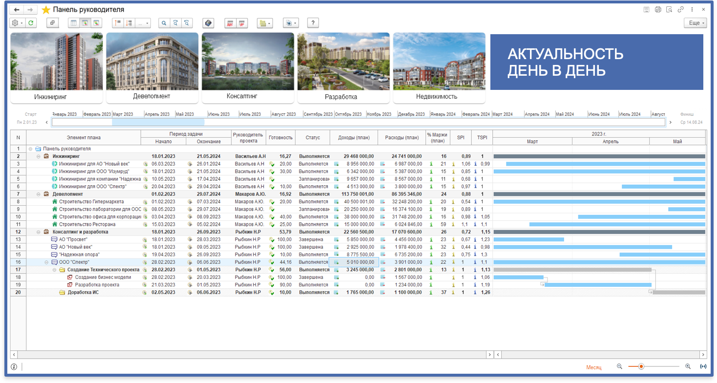Видеть срок по договору, плановые и фактические сроки выполнения работ, чтобы не росли затраты по проектам и снижались репутационные риски.